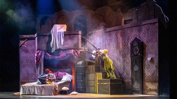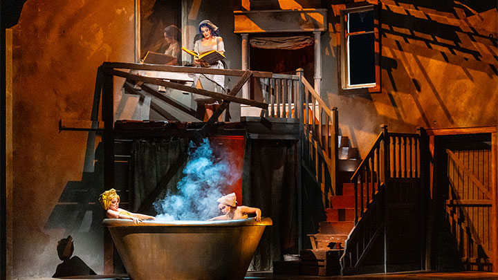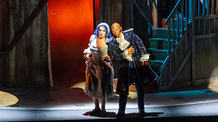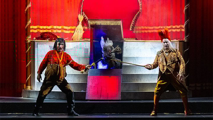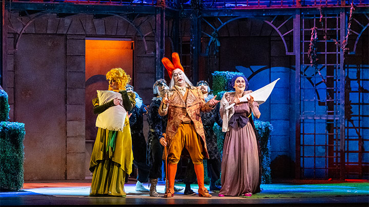 To give life to the vocal whirlwind of the score and the powerful comic elements of the libretto, the singers’ performance is inspired by the Commedia dell’arte, and the visual universe is full of illusions and surprises. Like figurines struggling in a crazy music box, the characters move across a revolving stage, whose settings are gradually disguised. This rotating mechanism of deception is animated by the shadowy figure of the philosopher Fabio, embodying Ferretti’s well-meaning ideals. Each sharply drawn character plays a social and theatrical role to achieve their goals. With their deliberately exaggerated appearances, they all – perhaps unwillingly – highlight the masquerade they are part of.